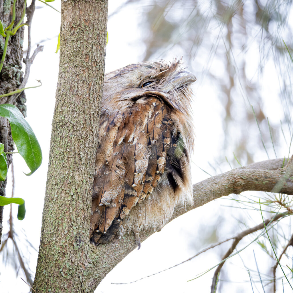 When I was first learning how to find tawny frogmouths during the daytime, I was told not to look for the bird itself, but for the tail. The rest of the bird can be almost impossible to see as it pretends to be a broken branch, while the tail often sticks out below at an angle completely opposite to what the branch should be. I’ve worked with these birds on multiple occasions, as they’re very widespread and generally easy to approach, but surprisingly hard to catch doing anything at all. I find them almost every time I’m out looking for owls — owls are rare, while frogmouths can be found in just about every park and observed daily. I even have a pair roosting and nesting in a local park just 100 metres from where I live.