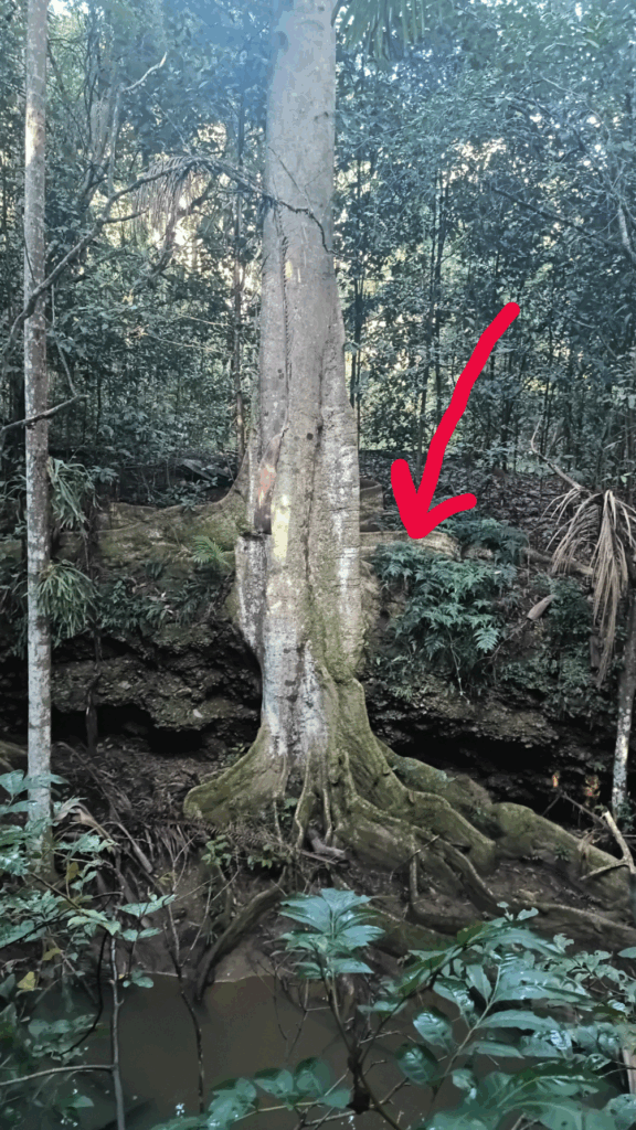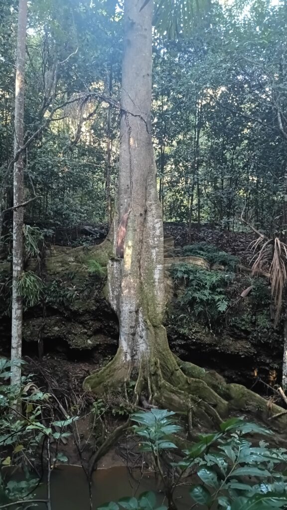 After days of tracking their calls echoing through the dense undergrowth, I stumbled upon what felt like the perfect stage. A vertical root of a strangling fig tree stood like a natural sculpture in a small clearing, draped with moss and surrounded by lush, layered ferns.