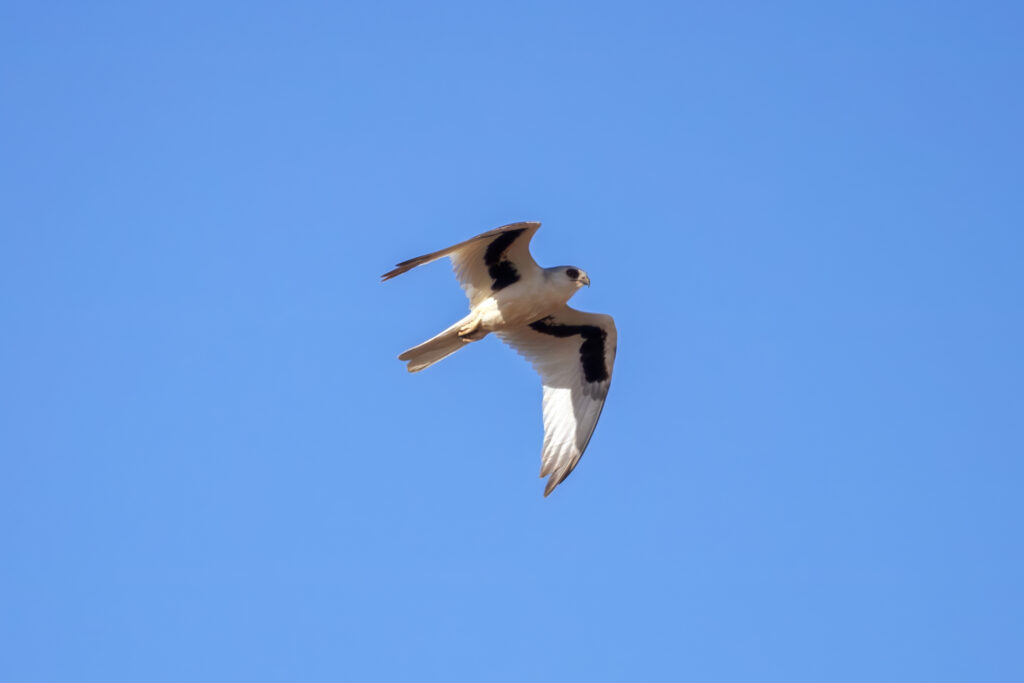 One afternoon, walking home through an area where Black-shouldered kites are usually seen, something darker caught my eye. It didn’t take long before the bird took flight, revealing the striking black lines across the underside of its wings — not the dark wingtips I was used to.