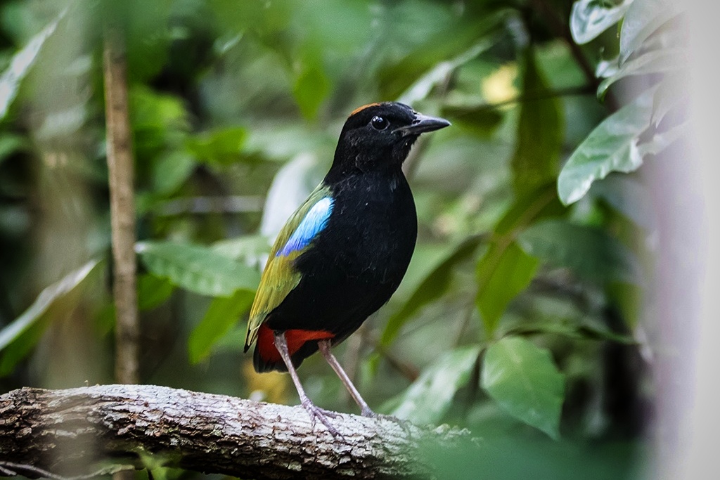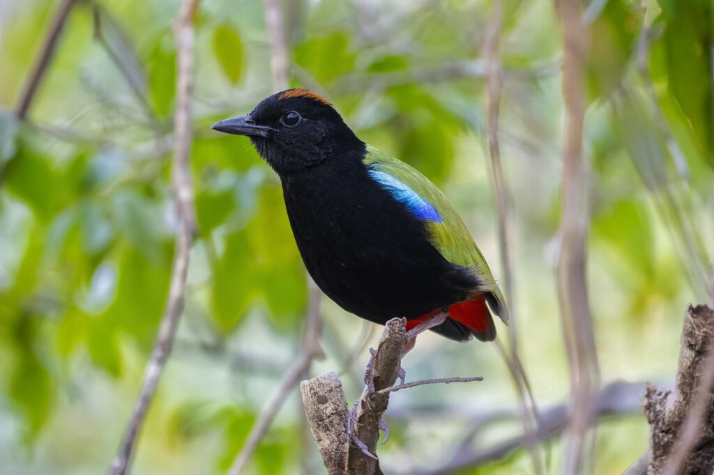 - Brilliant plumage – Despite foraging in dim forest undergrowth, rainbow pittas sport a striking combo of emerald-green wings, a velvety black head, a cobalt patch on the shoulder and a vivid scarlet rump.