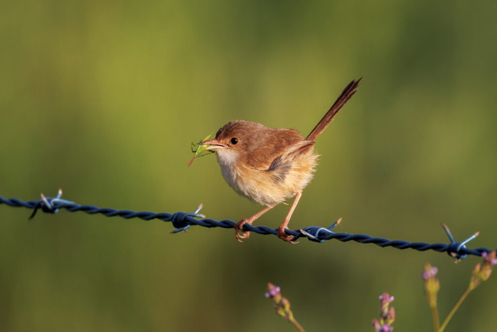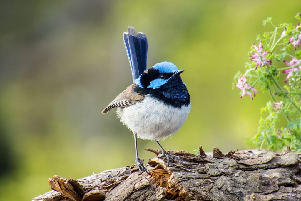 In the above image, a male superb fairywren stands proudly amongst a burst of wildflowers. That vivid cobalt blue never fails to catch the eye—especially when set against the delicate petals of native blooms. His upright tail, cocked like a tiny banner, is typical of the species and part of what makes them so endearing to watch (and photograph!).