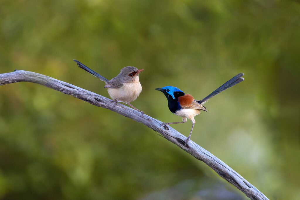 Male and female White-winged Fairywrens playfully perched on a branch